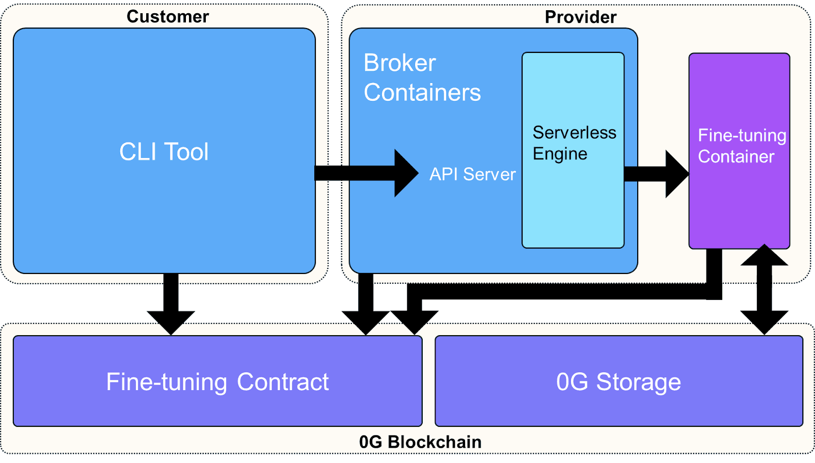 Below is a high-level representation of how fine-tuning is orchestrated within the 0G Compute Network: